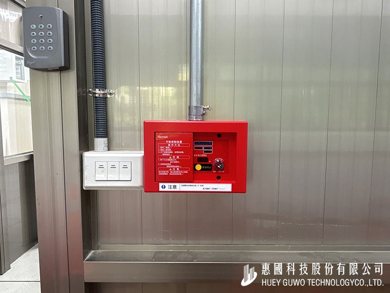 安全是惠國最重視的一環。我們在防護區門口安裝了緊急釋放與暫止按鈕 。此外,我們同步完成了空調系統的連動改接,火災發生時空調會自動關機,避免藥劑濃度被稀釋