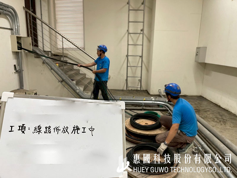 現場人員依圖說佈設動力線路,採用FR耐燃電纜與EMT管材確保施工品質與安全性。