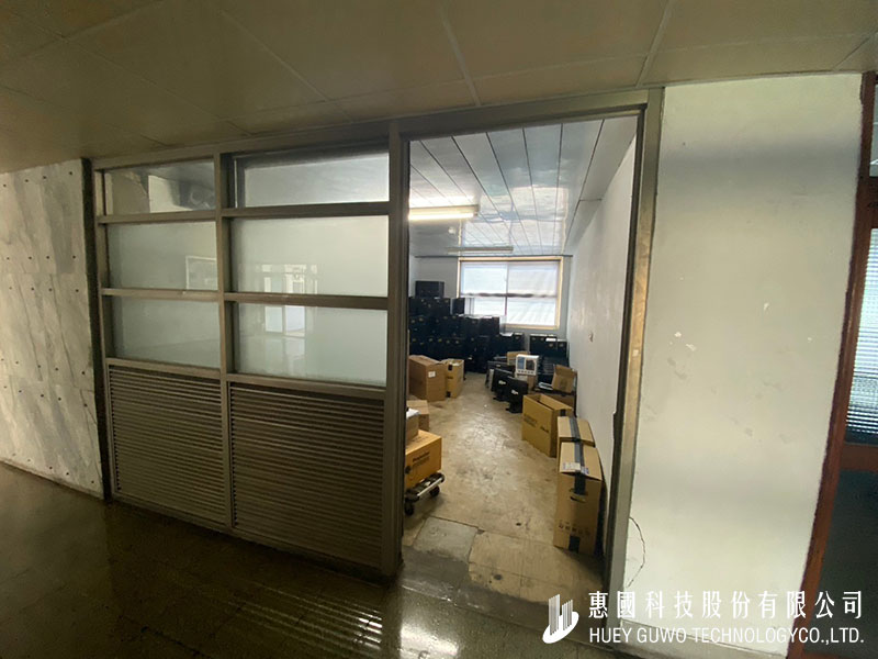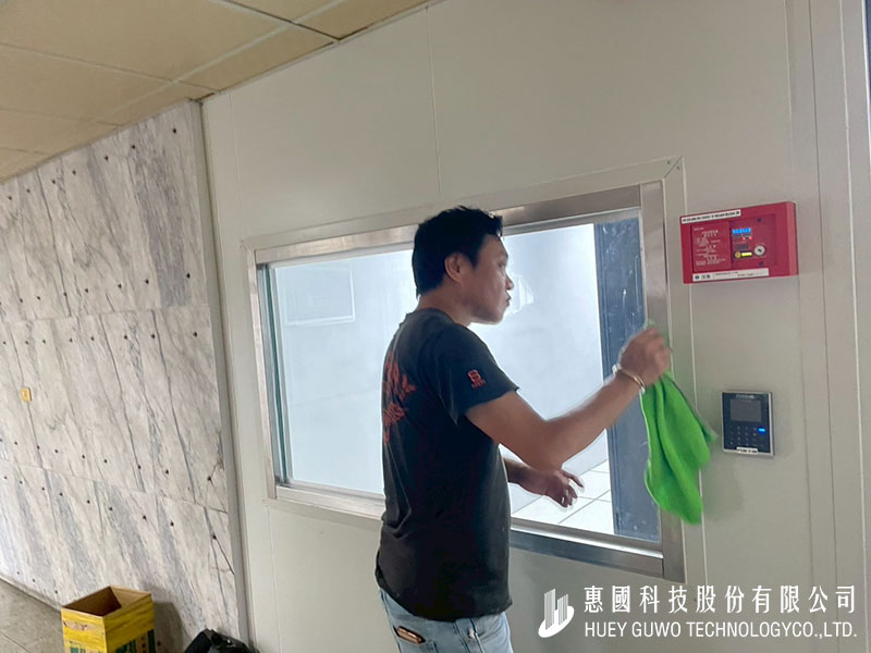 在完成庫板隔間後,隨即進行機房的 防火玻璃透視窗 安裝作業。