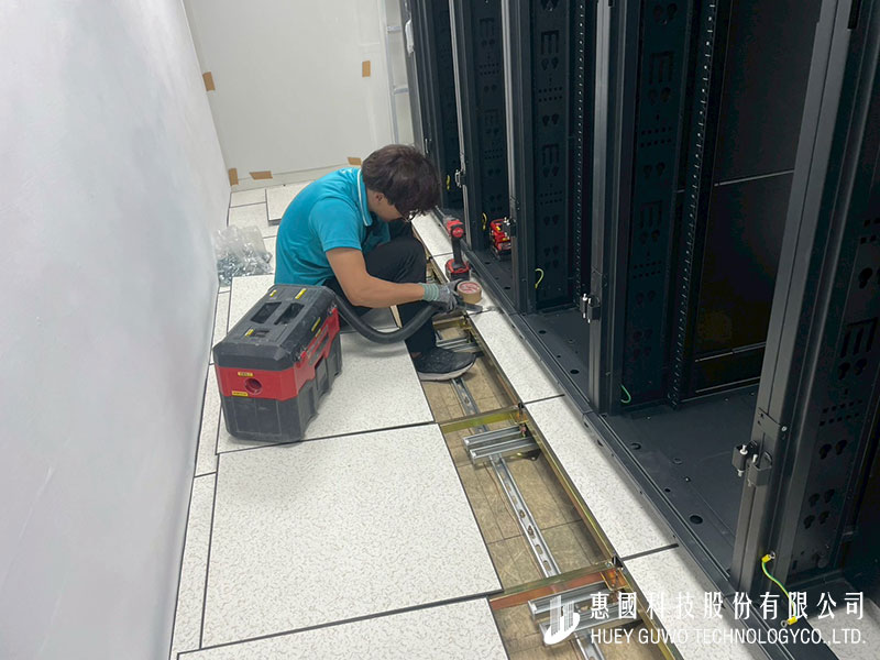 完成水平確認後,拆除機櫃下方必要的高架地板面板,進行 機櫃底部固定螺栓施作,確保機櫃不會因震動或拉線作業而發生移位。