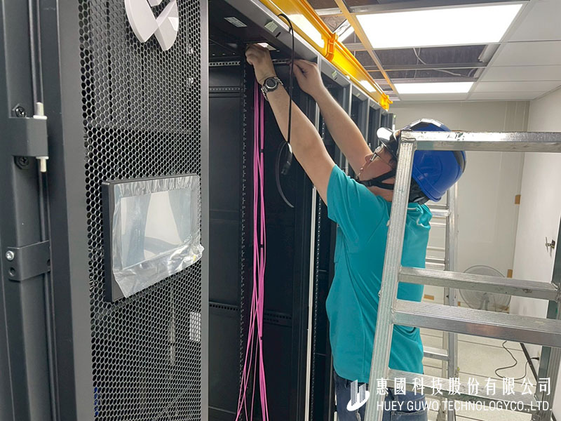 從照片中可以看到,工程人員將光纖與網路線由上方線槽引入機櫃,沿著側邊走線區往下整理,確保線材不垂落、不壓線,後續設備上架時不會卡線。