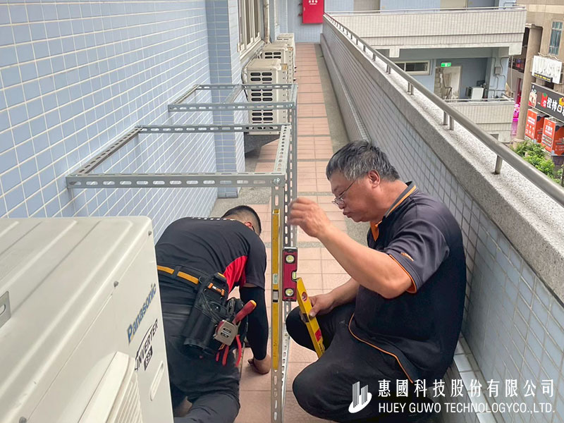 從照片可以看到,先在室外側完成室外機定位與支架施工,支架在安裝前都有先做水平校正,確保設備放上去後不會傾斜或晃動,這一點對後續運轉穩定度很重要。
