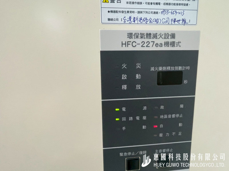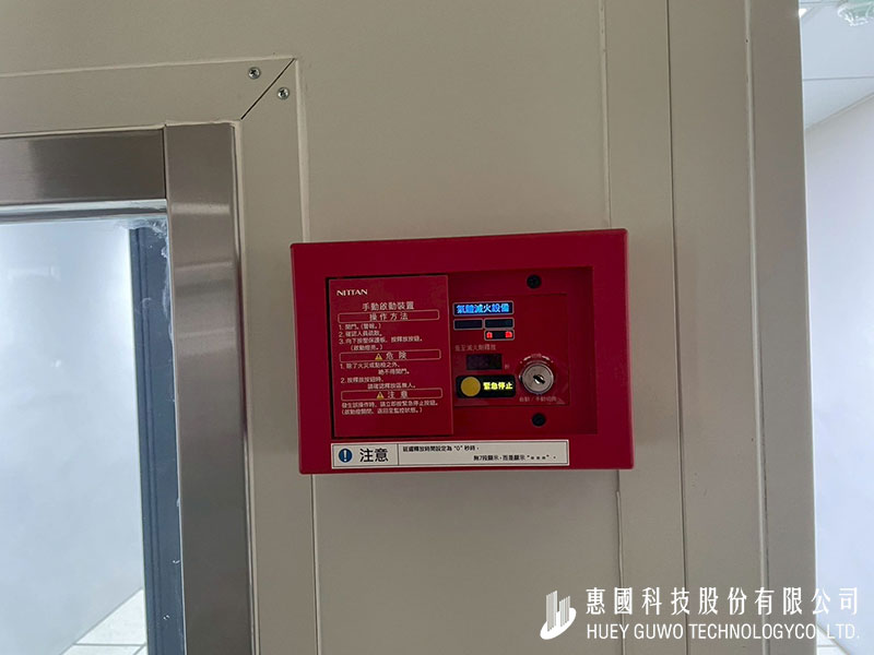 本系統採用 HFC-227ea(FM-200)環保氣體滅火設備,可於火災偵測後快速釋放滅火藥劑,在不影響設備運作的前提下,有效抑制火源並避免二次損害,符合機房與資訊設備使用需求。