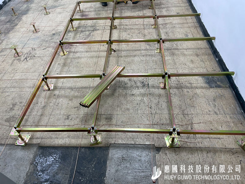 現場開始架設 500 型高架地板支撐架,並同步進行 2mm 接地銅網的鋪設與固定,確保未來機房具備良好的導電與等電位環境。