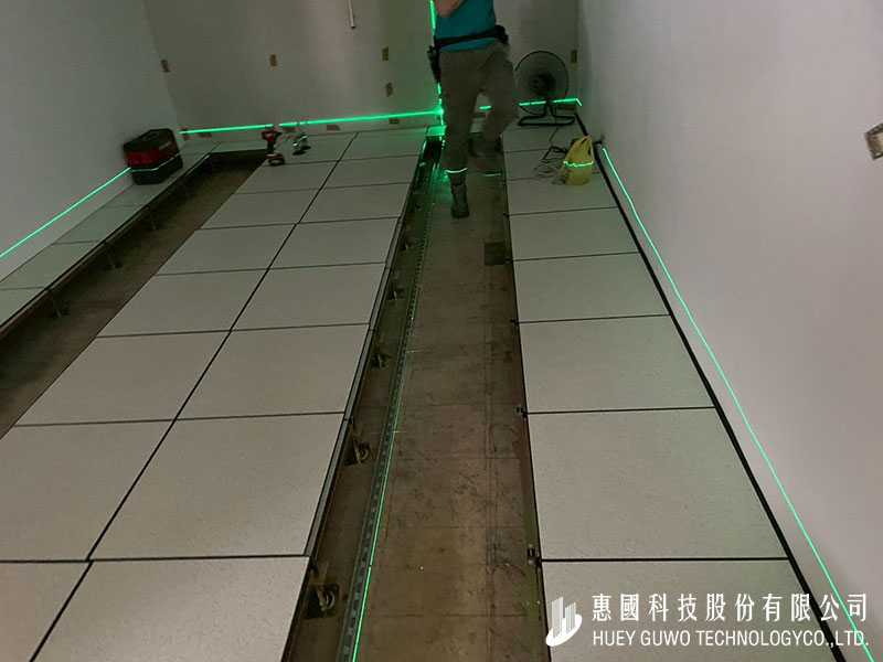 首先利用雷射水平儀在地面與牆面進行放樣,明確標示每一台機櫃的 中心線、排列方向、冷熱通道位置與走道寬度,確保整體配置與設計圖一致。