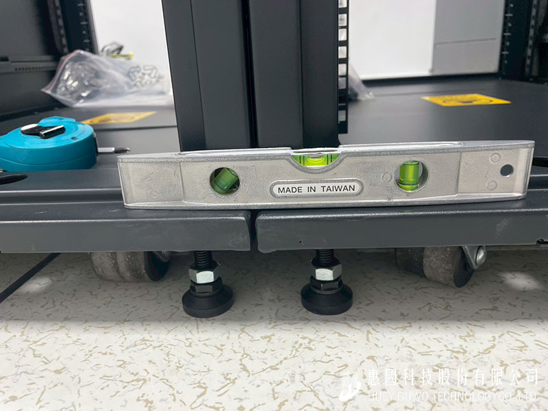 機櫃搬入後,使用水平儀進行前後、左右的 水平校正,並逐一調整防震腳座,使機櫃在高架地板上具有良好的穩定度與耐震性。